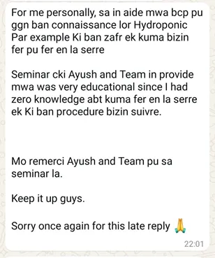 Corporate employees looking for a new challenge. Sort inpe depi sa Ébène, Kirpip and Porlwi vibe la. Vinn aprann kouma pou build ek manage enn la serre hydroponic.